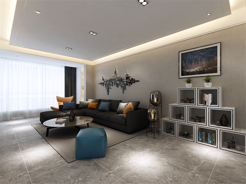 2.饰物:可选择亮色的银色光泽金属画框的装饰画悬挂在墙面上,对整体颜色进行中和。一些叶宽、大型的绿植也可以装饰客厅,为空间带来一些活力来补充。