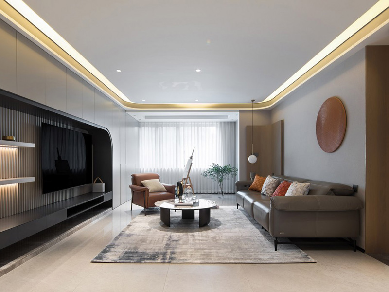 以米白、深灰的低饱和色调定克制基调,浅棕与木饰面注入温暖质感,皮质、石材的点缀强化精致度。冷暖材质碰撞出层次,却无冗余装饰,让空间在简约形制里,既显整洁秩序,又藏生活温度,避免寡淡感。