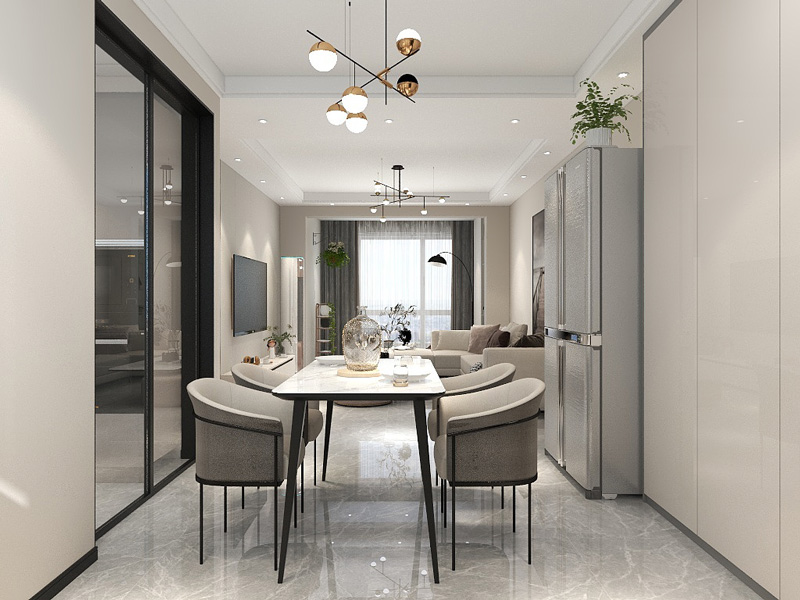 相对独立的餐厅环境,比起随便找地方吃饭,在餐桌上吃更有仪式感。那么餐厅家具尺寸按照实际空间进行选择,不宜追求过大,过大会显得空间很拥挤,而且餐桌椅的位置摆放布局与墙面需要预留一些位置,方便拉出椅子,得到有一个比较宽松的用餐环境。
