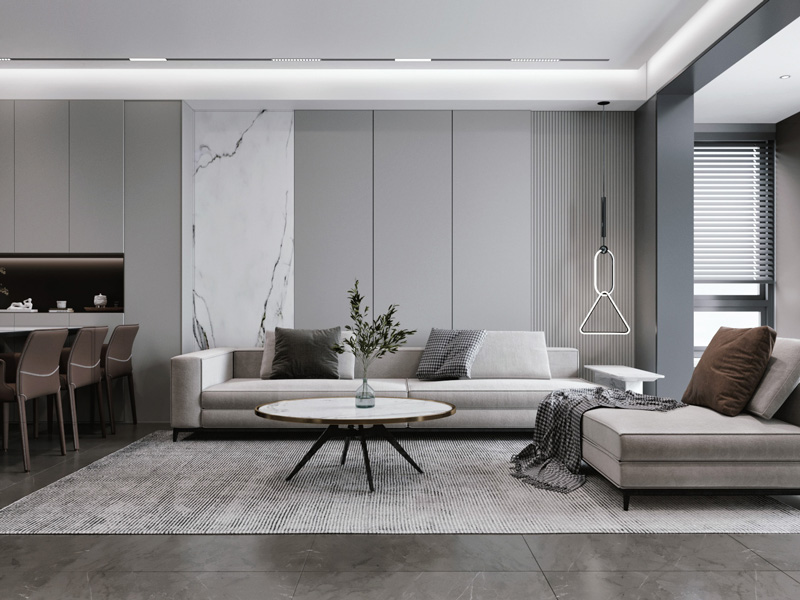 本案以现代简约风格为内核,黑白灰与米棕为中性主调,借利落线条、金属与石材等质感材质构建层次。诠释“干练与舒适共生”的居家美学,为居者打造兼具格调与烟火气的现代生活场域。