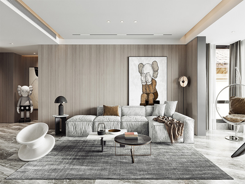 以米白、深灰的低饱和色调定克制基调,浅棕与木饰面注入温暖质感,皮质、石材的点缀强化精致度。冷暖材质碰撞出层次,却无冗余装饰,让空间在简约形制里,既显整洁秩序,又藏生活温度,避免寡淡感。