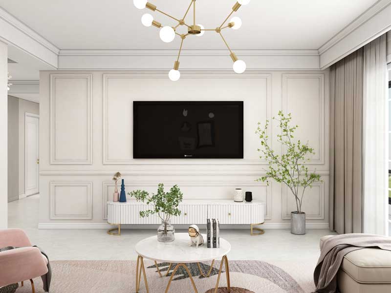 客厅背景墙的石膏线设计为空间带来稳重的美式气息,清透的色调与绿植搭配,为空间增添了一番活力。