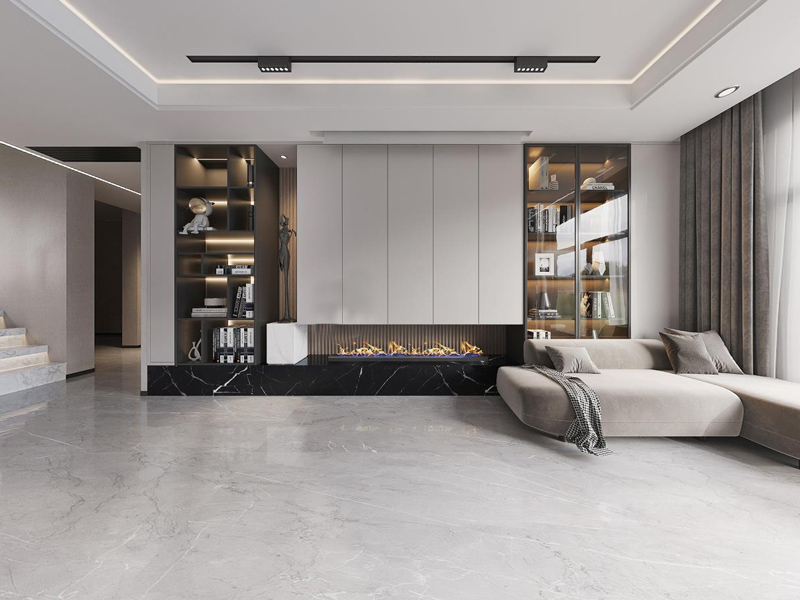 客厅背景墙设计是空间的一个亮点,透明柜体搭配隐藏灯线设计提升空间格调,化繁为简,大气美观。