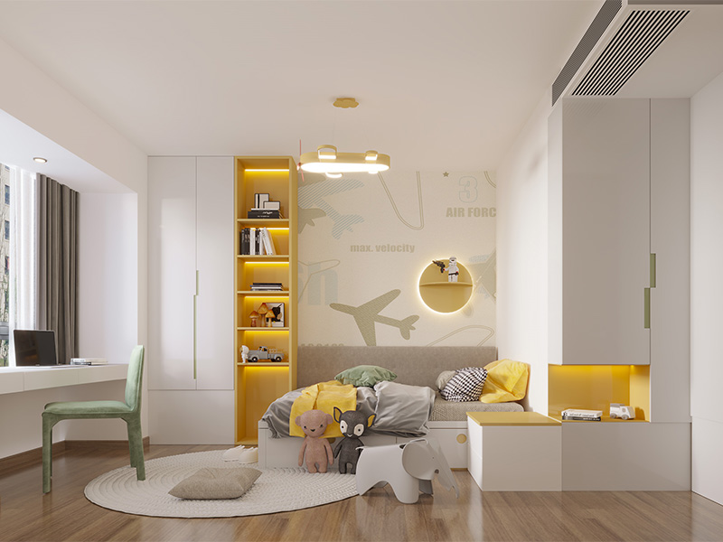 儿童房一般面积不会太大,建议做好空间的规划布局,平衡睡眠、收纳、学习和娱乐等功能区域的视觉面积。