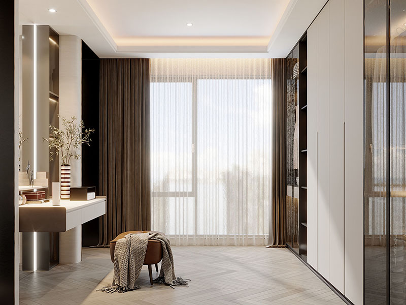 衣帽间除了用于集中收纳家庭成员的衣物、鞋包,还具备展示和梳妆等功能,需要有充足的空间,避免造成视觉凌乱感,影响居住心情。