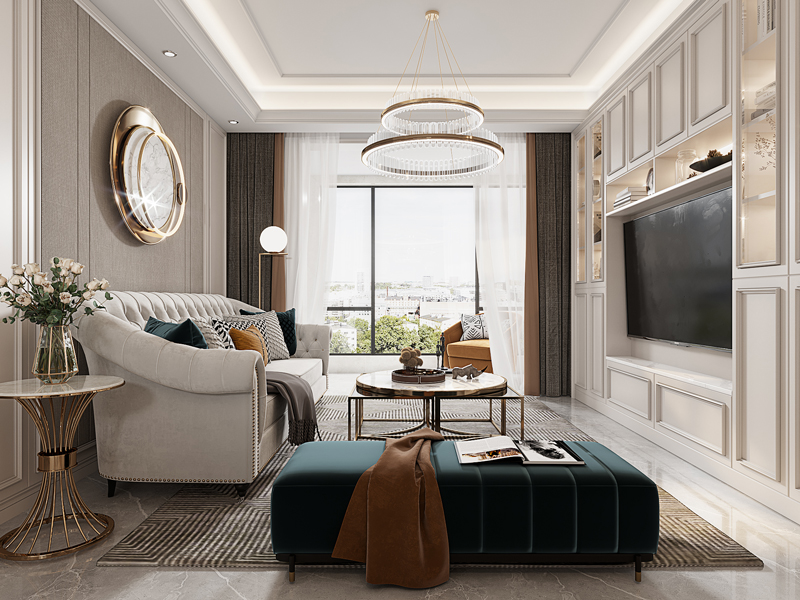 客厅整体设计稳重中不失优雅,线条感的电视背景墙营造美式的基础,再搭配上细节的金属细节,呈现精致的居所。