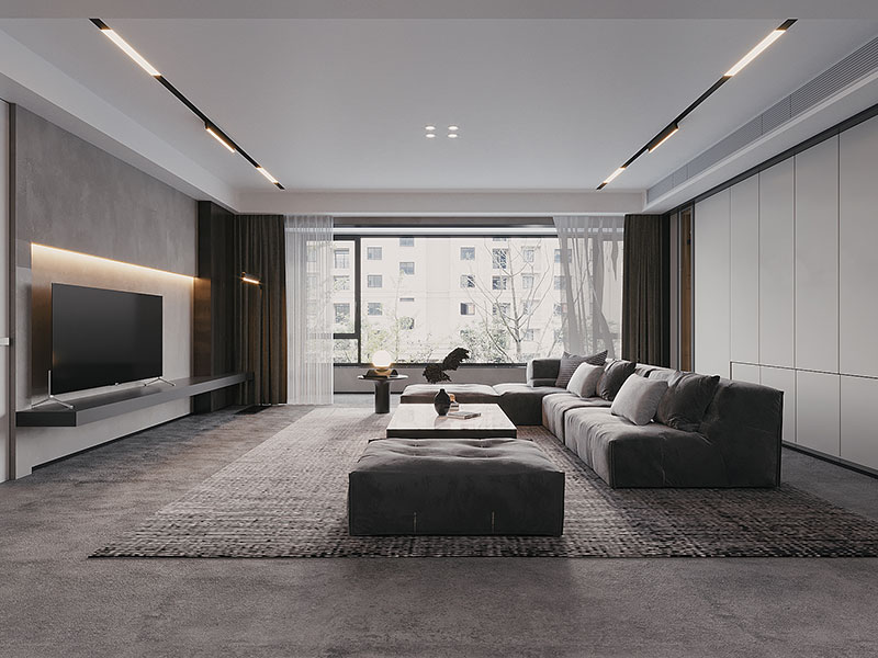 以黑白灰为空间色彩基调,结合低调质感的软装和无主灯设计等,诠释极简生活美学。考虑到客厅储物能力有限,在背景墙中融入收纳设计。
