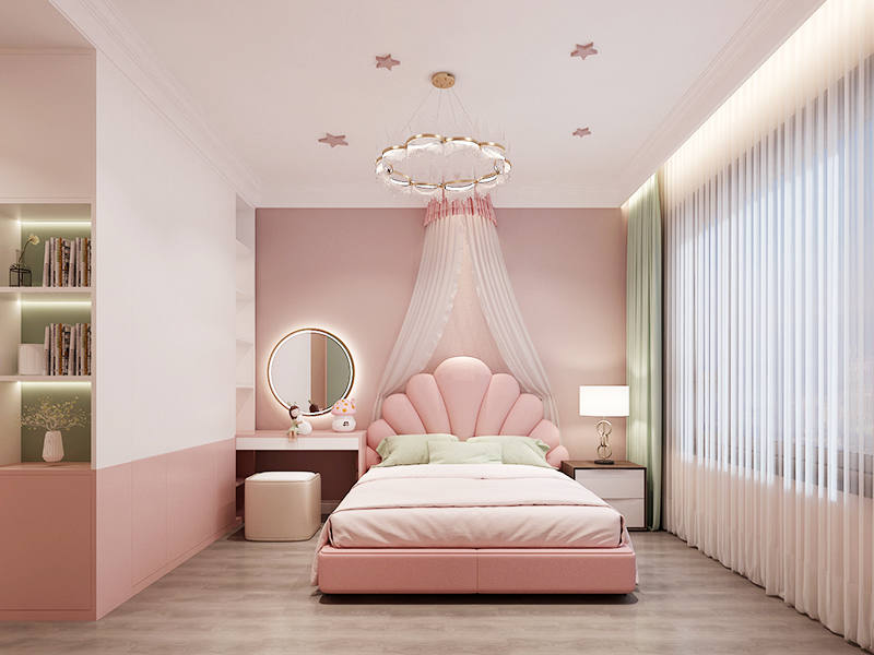 可以巧用粉色系的床品、窗帘或者玩偶等软装元素,进一步营造女生的浪漫粉色系居室,也为空间增添童趣氛围。