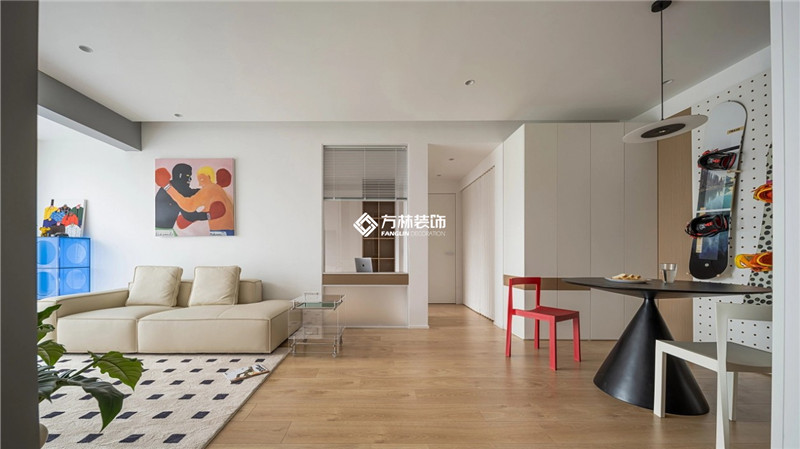 餐厅和客厅相连,黑色的圆桌搭配色彩鲜艳的餐椅,点亮了整个空间。飞碟形状的吊灯设计感十足,给餐厅带来艺术美感。墙面设计洞洞板,收纳滑板和其他物品,增加空间层次感。