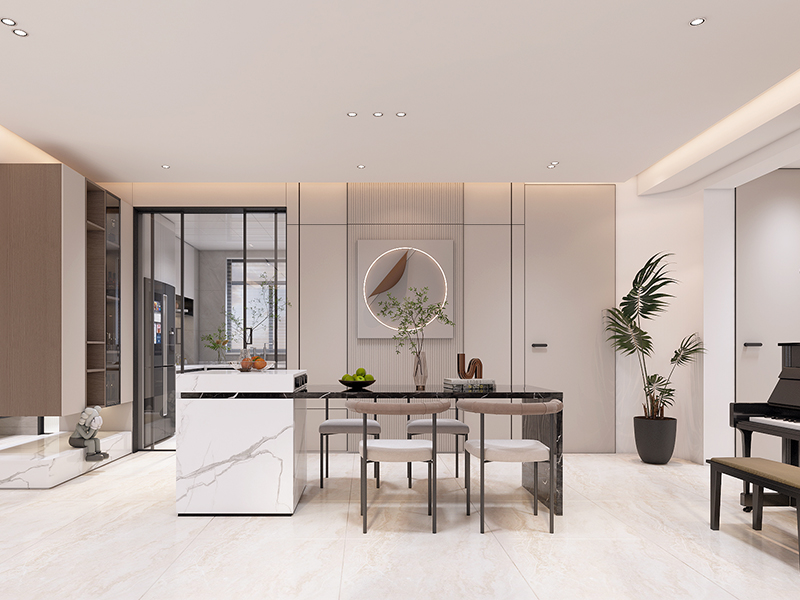 餐厅做开放式布局,风格和选材与客厅、厨房保持和谐统一,彰显居室的视觉整体性。采用岛台餐桌设计,满足家庭成员日常用餐需求,也为居室增加时尚格调。