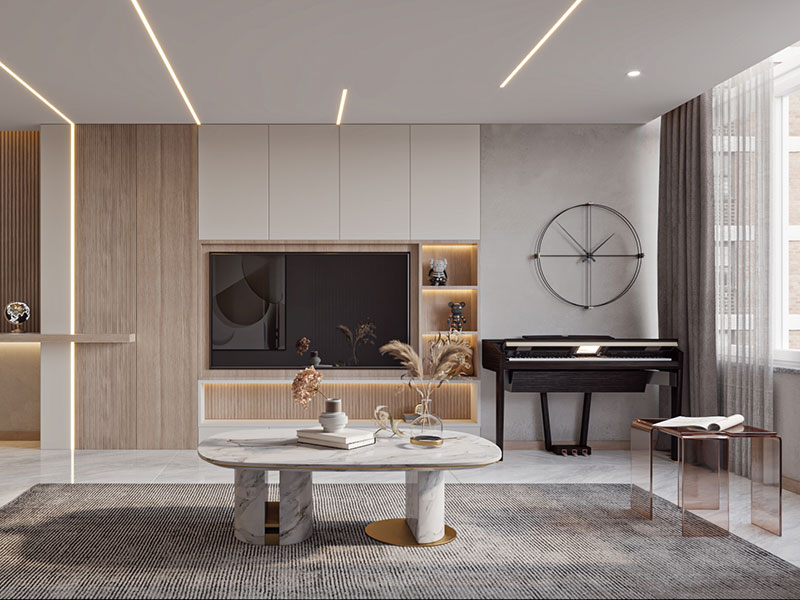 可以将电视柜与背景墙相结合,呈现收纳式电视墙设计,既丰富居室的储物能力,又彰显简洁时尚的设计美学。
