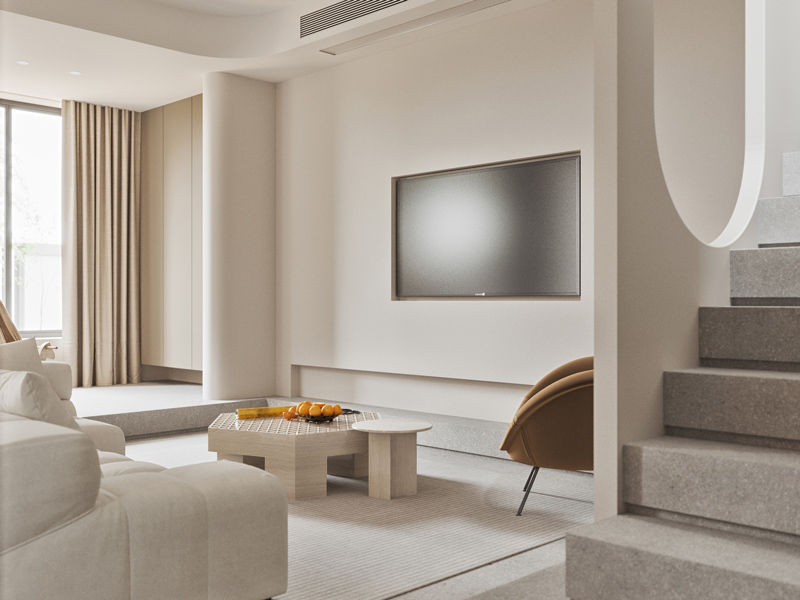 客厅区域多用造型细节来丰富空间效果,展现出舒适、惬意的空间氛围,以少胜多以简胜繁,通透美感。