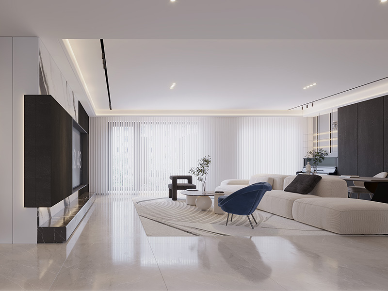 本案是大平层户型,遵循当下的实用美学理念,巧用黑白灰色调结合无主灯设计和开放式布局等,诠释极简生活美学。