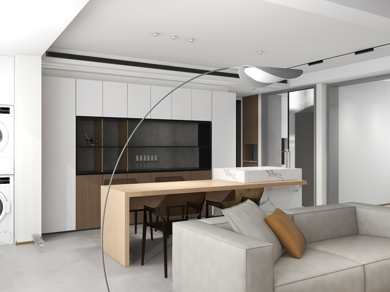 餐厅区域采用开放式布局在客厅后侧,区域视觉更丰富饱满避免冷清,岛台与餐边柜设计增加操作空间保证收纳需求。