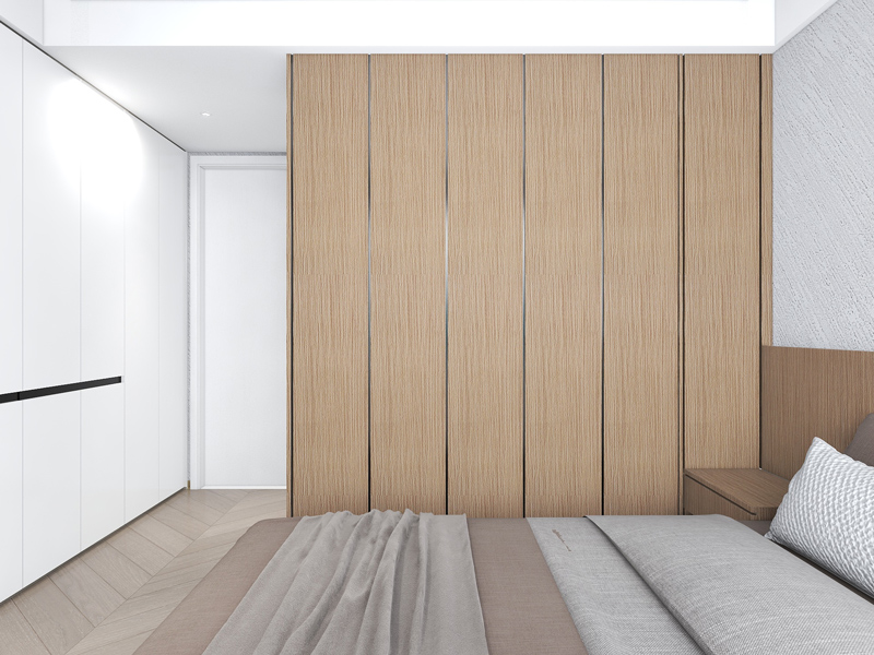 卧室空间视觉上更加自然明朗,大面积收纳柜布局于空间中,空间实用性更强,木质材质融入和谐舒缓更有助于睡眠。