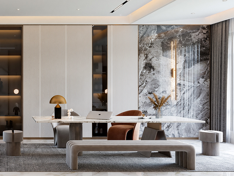 从开放式办公区望向客厅休闲区,金属线条点缀在硬包设计电视墙上,实现挂放电视机功能需求的同时,彰显居室空间的时尚惬意氛围。