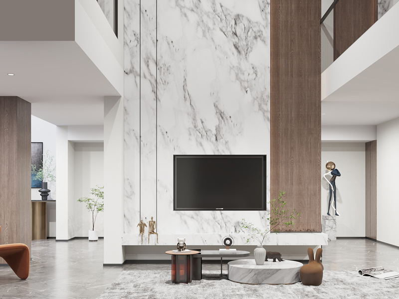 客厅区域挑高的设计,视觉上更开阔大气,背景墙采用大理石与木质搭配拼接设计,呈现自然丰富。