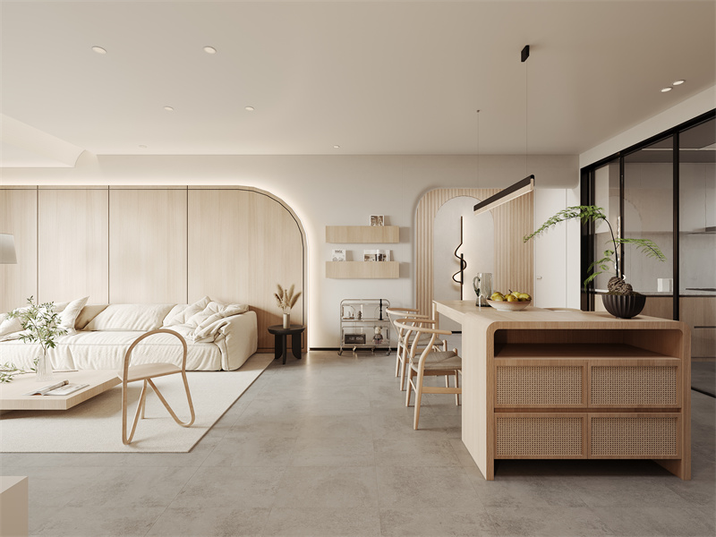 本案以原木元素串联,在满足社交、烹饪、睡眠、卫浴等多元生活需求的同时,借自然材质的温暖与简约设计的利落,诠释出兼具舒适与质感的原木居家美学。
