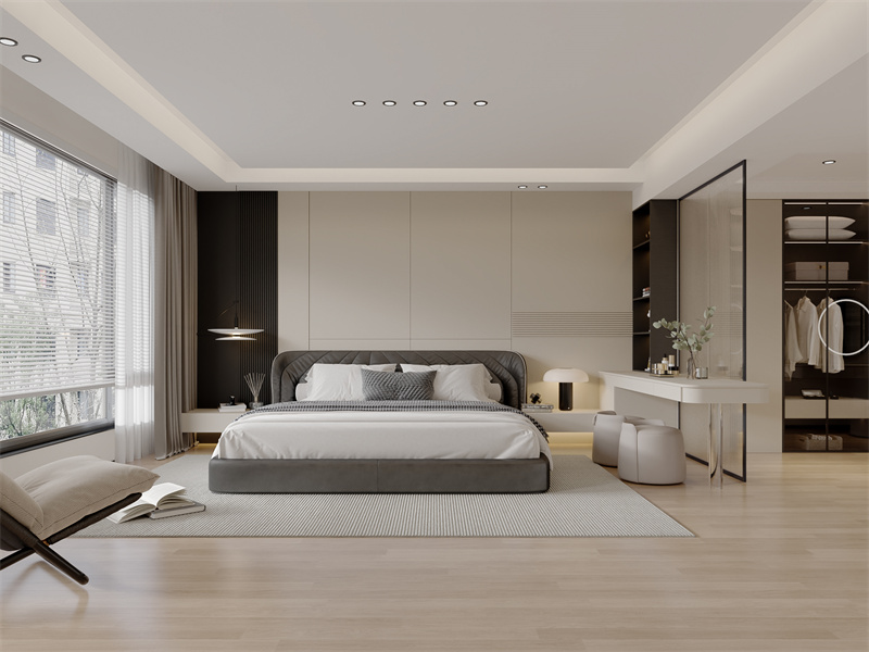 如上述案例图中所示,在卧室的床尾一侧,巧用玻璃屏风+梳妆台的设计形式,将睡眠区与衣帽间分隔开,彼此互不干扰,还建立视觉关联感,彰显惬意氛围。