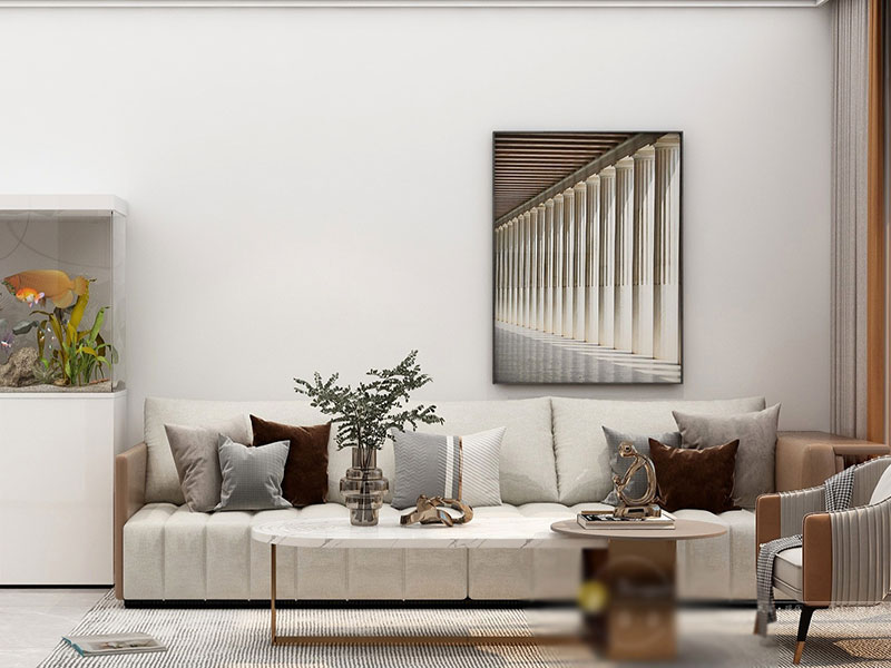 沙发墙同样采用留白的艺术,用简单墙漆装饰,并搭配装饰画,与低调质感的沙发、茶几等形成呼应,营造雅致惬意氛围。