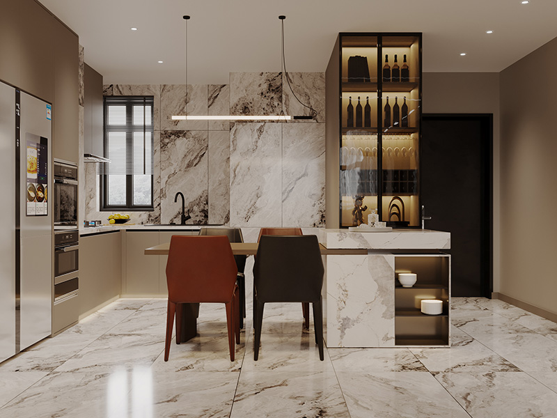 在厨房空间融入中岛台设计,可以增加备菜操作台面,同时也可以用来收纳一些餐具、厨具或者小型家电等,还能做早餐桌等使用。