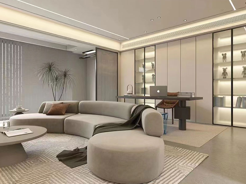在沙发墙一侧预留充足的活动空间,设计满墙式书柜,并搭配简洁时尚的书桌椅,呈现敞开式布局的书房。