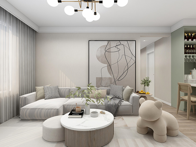 摒弃繁复的造型装饰,基础硬装设计以简单干净为主,可在地面融入原木色地板,进一步增加居室的自然柔和氛围。