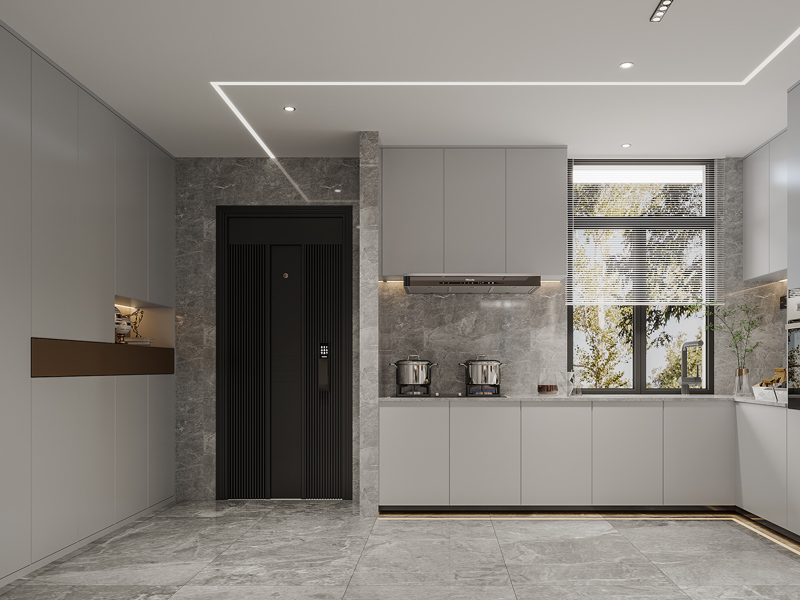 玄关区域光线较差,将厨房的墙体打通来增进整体采光,同时让视觉上更通透,无主灯设计让两个空间衔接起来,连贯和谐。