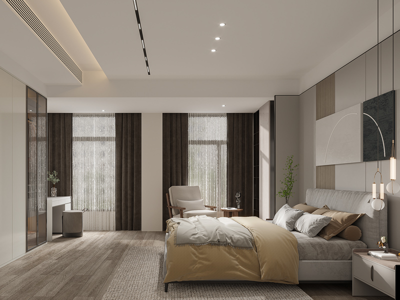 卧室整体开间较大,采用床尾柜的设计,更大限度的提升实用性,背景墙设计让空间更雅致丰富。
