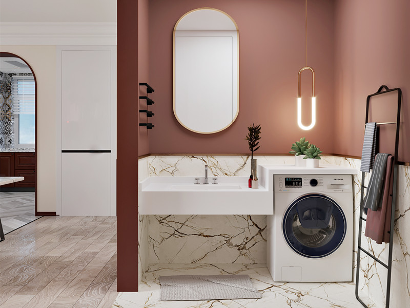 虽然将洗漱区融入客厅、餐厨等区域,呈现开放式洗漱区,但也建议融入半墙、玻璃隔断等设计,明确划分洗漱区与其他功能区域,彰显整个居室的视觉整体性。
