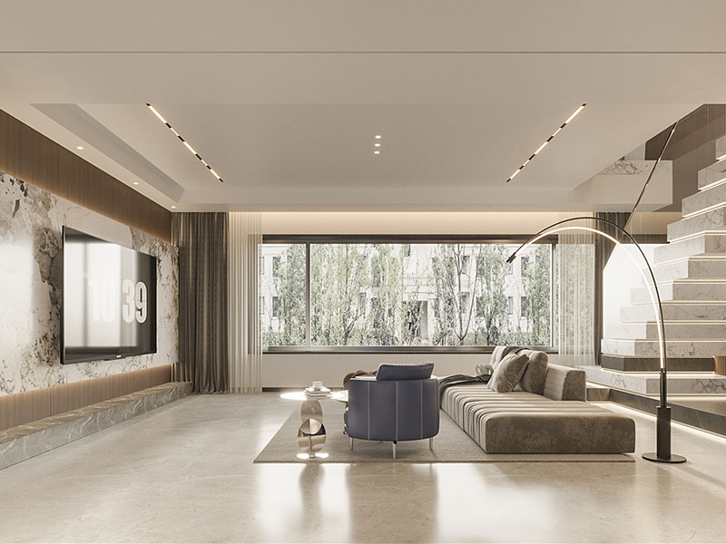 巧用石与木的组合设计,呈现彰显时尚大气质感的电视墙,与造型茶几、沙发等相搭配,诠释极简生活美学。
