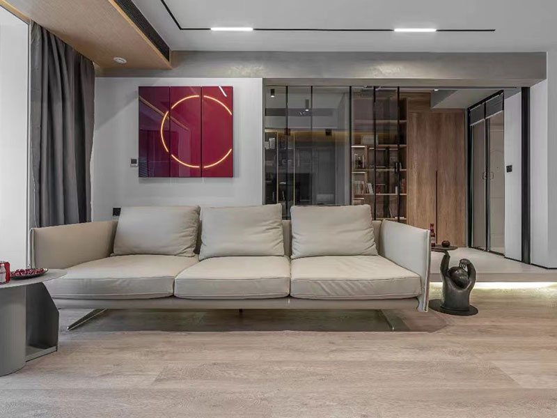 运用留白的艺术,在黑白灰色调结合无主灯设计装饰布局的客厅空间,融入展示柜、手办等,让功能与艺术碰撞。