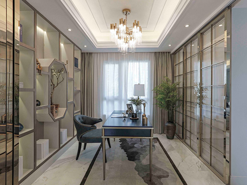 单独规划一个房间做书房,设计满墙式展示型书架,搭配简欧风的书桌椅,呈现实用性与艺术美学的碰撞。