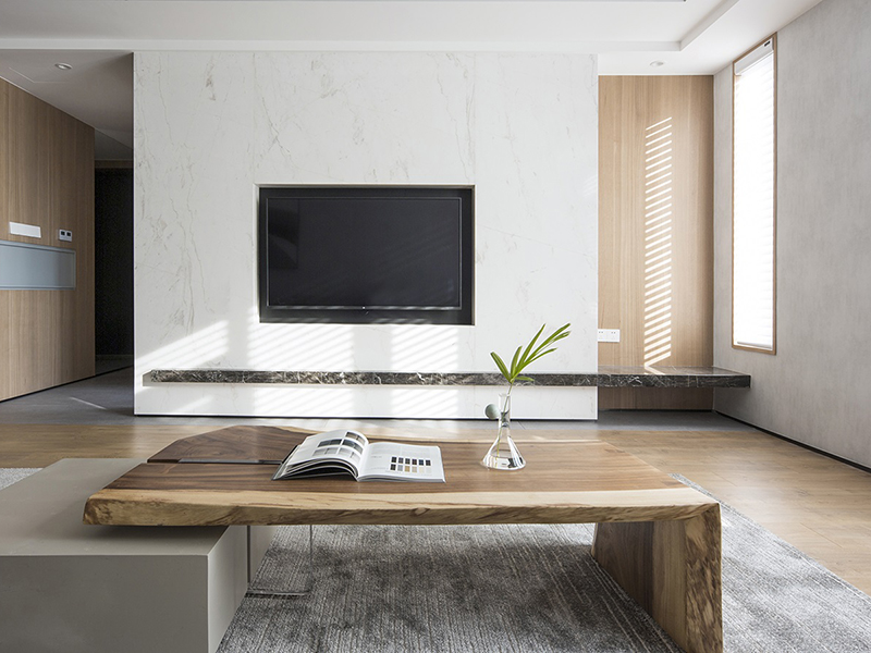 在简洁时尚的电视背景墙中,同样融入木饰面元素,与沙发墙形式呼应,彰显居室空间的视觉整体性。