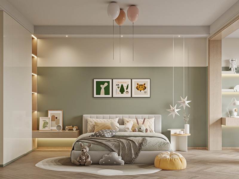 不同颜色的墙漆会呈现出不同的气质,比如将不同色彩组合搭配在一块,绘制出一幅卡通画,既清新又有层次感,为空间增添童趣与活力。