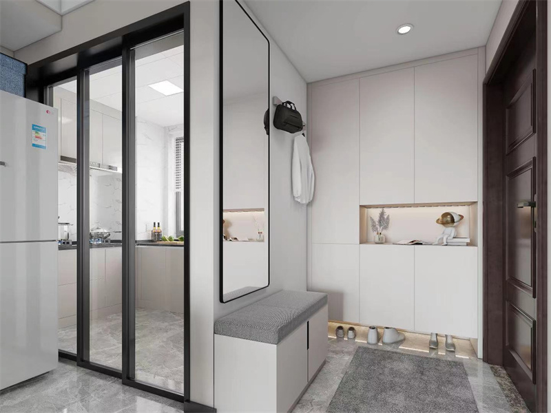玄关设计简约实用,挂衣区与换鞋凳方便日常使用,白色柜体满足收纳需求,打造出整洁舒适的入户过渡空间。