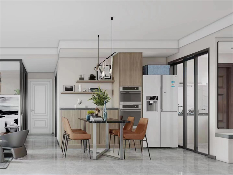 餐厅与厨房相邻,开放式布局方便备餐用餐,动线更舒适,木色餐边柜,自然温馨,提升区域实用性。