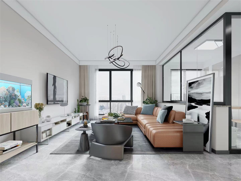 以浅色调为主,基础设计十分简洁,通过软装装饰提升空间品质感,棕色皮质沙发,气质十足,采光充足,视野开阔。