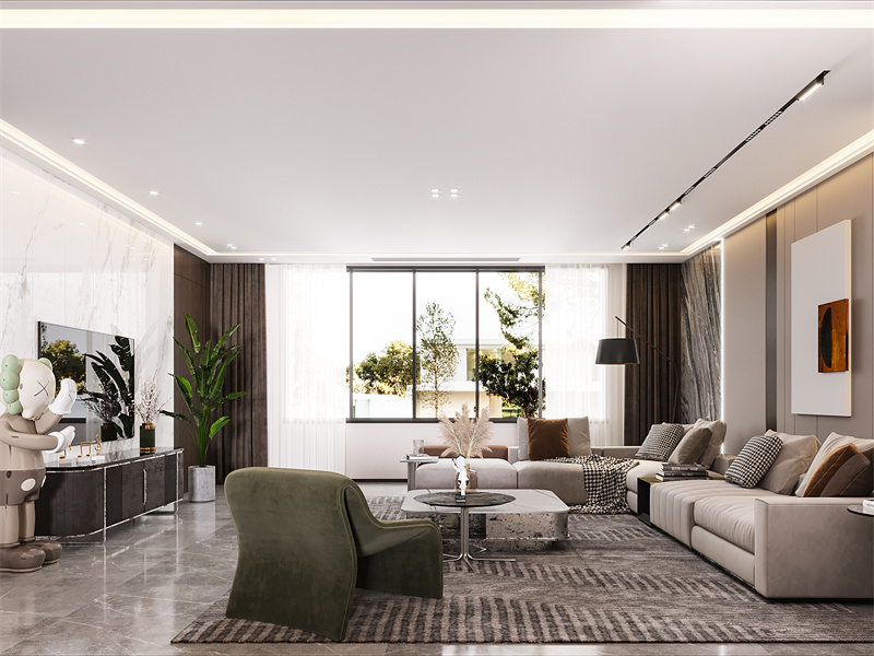 本案客厅的意式极简风格体现在空间与细节之中,整体以中性色调为主,深浅冷暖不同的灰色相互交织,营造出低调且有层次感的视觉感受。