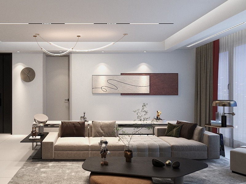 客厅呈现现代简约风,色调柔和。浅米色沙发搭配深色抱枕,质感舒适。无主灯设计结合造型吊灯,光线层次丰富。