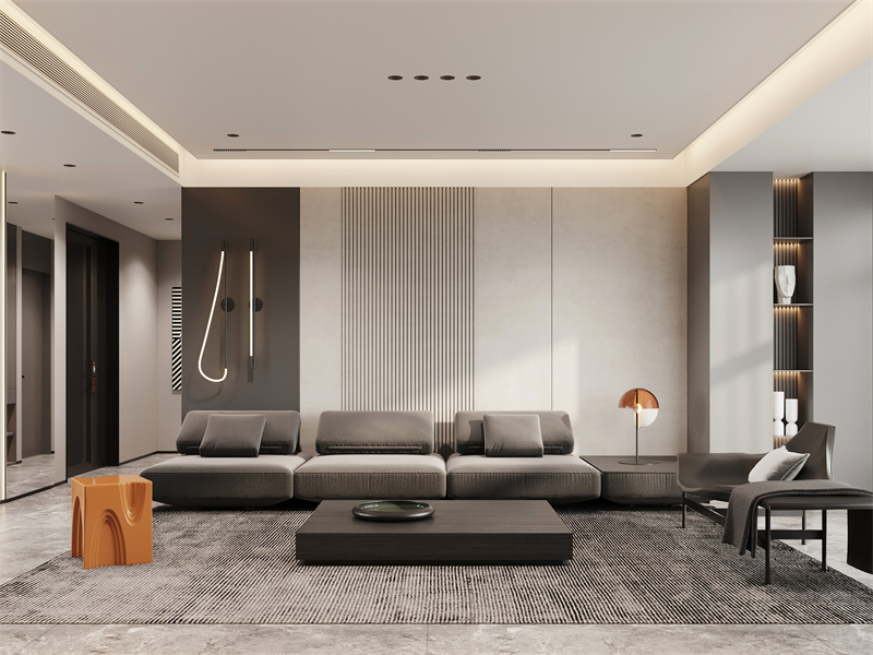 本案家装以现代轻奢风格为主调,巧妙融合简约与精致。整体色彩沉稳而不失活力,深灰、深棕搭配中性色,间以橙色点缀,营造出低调轻奢的氛围。