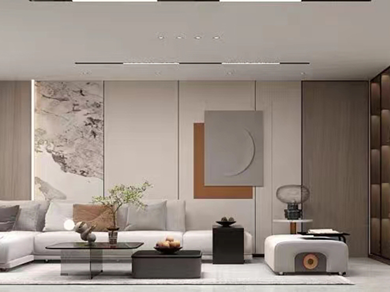 以浅米色、灰色为主色调,营造柔和宁静氛围。简约的白色沙发搭配同色系抱枕,辅以深色茶几,层次丰富。
