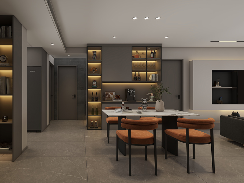 餐厅与客厅共享同一空间,通过 “留白” 设计实现功能分区。餐边柜嵌入灯带,夜间暖光漫反射营造温馨用餐氛围。