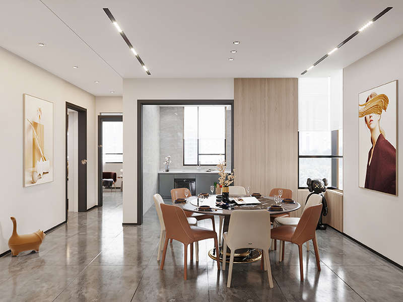 整体空间采用暖色调,比如墙面刷奶茶色乳胶漆,搭配焦糖色皮质餐椅、咖色餐边柜,营造秋冬感围炉氛围。或者大面积采用米白、浅灰,并用复古绿餐边柜、克莱因蓝餐具或姜黄色桌布做局部跳跃。