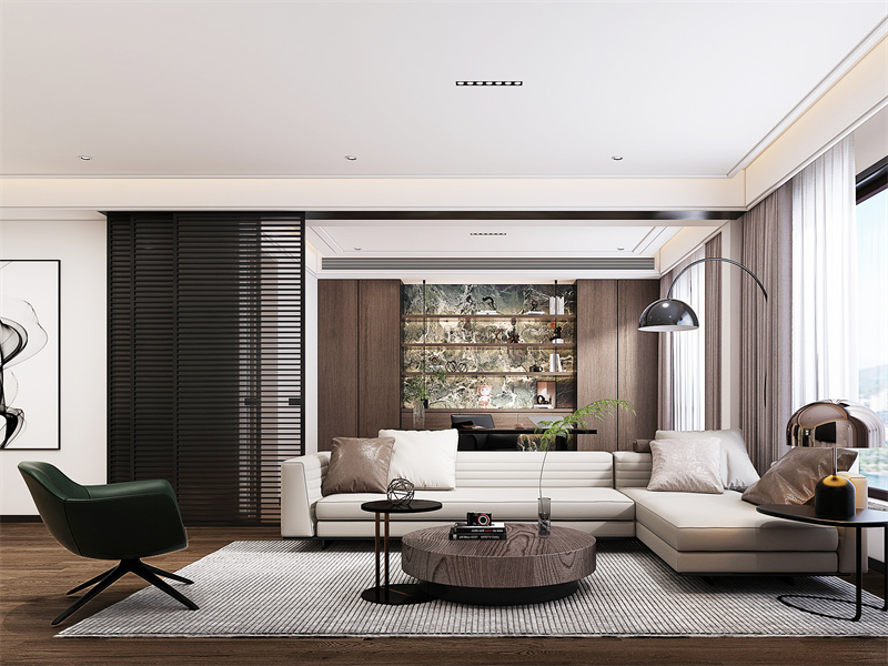 现代风格客厅以简洁为魂,白与木棕营造冷静秩序。无主灯借线性光勾勒开阔,大幅岩板电视墙与艺术挂画呼应,绿植、弧形单椅柔化硬朗。
