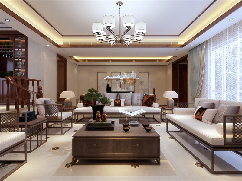 以米白、木棕为主色调,融合新中式线条与现代极简框架。开放式布局适配家族团聚与品茶休憩,用中性暖色诠释“简而有韵”的现代东方美学。