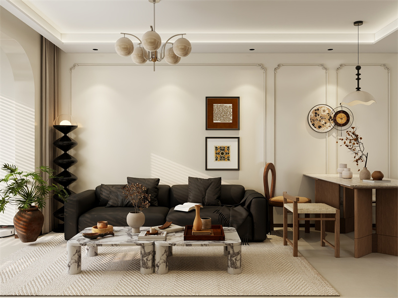 以轻复古为脉络,通过线条雕花、异形家具混搭,打破风格边界。深棕沙发与浅色基底形成张力,装饰画、绿植、复古摆件串联场景,吊灯与落地灯组合构建多层次照明,打造松弛又具艺术感的社交区域。