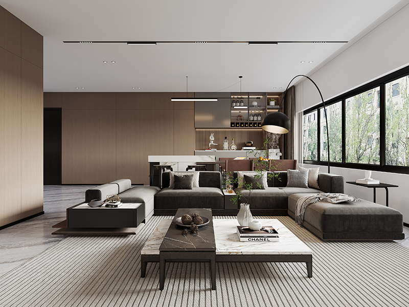 以米棕为主色调,大理石电视墙彰显意式奢感,木饰面柔化硬朗。悬浮式柜体嵌入收纳,弧形沙发适配围合交流,无主灯借线性光勾勒层次,满足社交与休憩,诠释意式轻奢的优雅松弛。