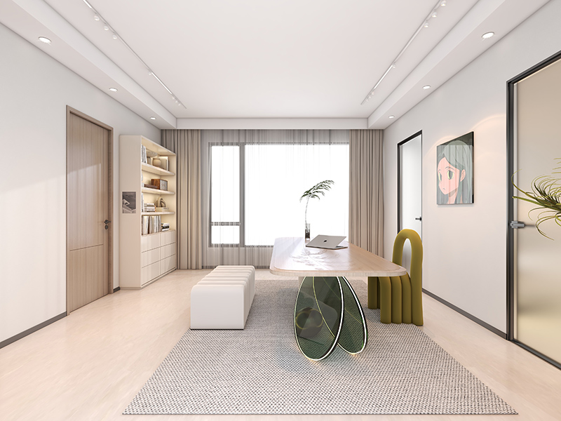 以白、木色为底,打造轻盈通透的工作学习区。造型艺术时尚的书桌椅,打破传统书房的沉闷;开放书架与封闭收纳结合,满足藏书、展示需求。
