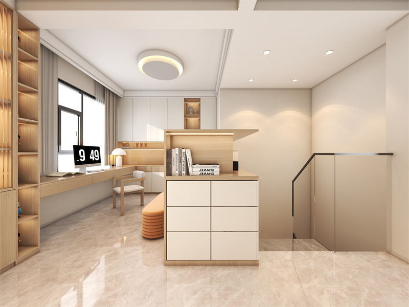 延续浅木色基调,开放式书架与封闭柜体结合,满足藏露需求。悬浮书桌搭配圆弧座椅,柔和灯光照亮工作区,预留休闲坐榻,适配办公、阅读、临时休憩等。
